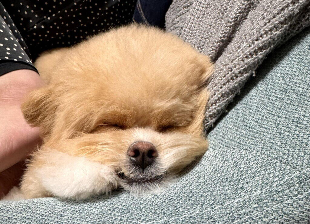 一方、5kgに成長した今のパフィは、まんまるのボディにふわもこの被毛、ぬいぐるみのような見た目。リビングのソファに丸くなって寝ている姿は、まるで大きなぬいぐるみがそこにいるかのよう。子犬の頃の「小動物感」とは全然違う、キャラクターグッズのような可愛さが加わりました。